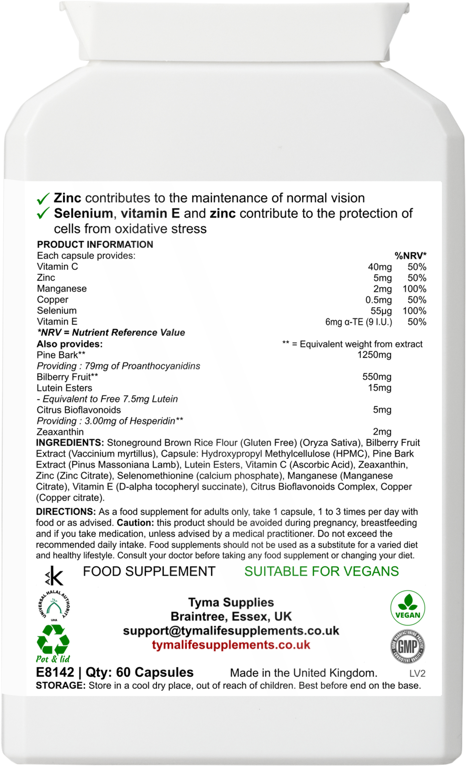 Stoneground Brown Rice Flour (Gluten Free) (Oryza Sativa), Bilberry Fruit Extract (Vaccinium myrtillus), Capsule: Hydroxypropyl Methylcellulose (HPMC), Pine Bark Extract (Pinus Massoniana Lamb), Lutein Esters, Vitamin C (Ascorbic Acid), Zeaxanthin, Zinc (Zinc Citrate), Selenomethionine (calcium phosphate), Manganese (Manganese Citrate), Vitamin E (D-alpha tocopheryl succinate), Citrus Bioflavonoids Complex, Copper(Copper Citrate)